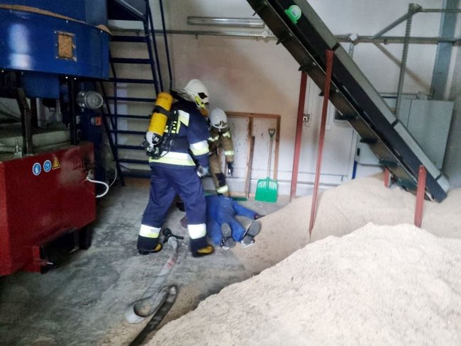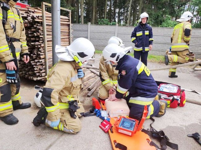 Na miejsce zadysponowano w pierwszej fazie zastępy z Ochotniczej Straży Pożarnej w Sypniewie oraz Więcborku. Po przybyciu na miejsce pierwszych zastępów okazało się, że pali się suszarnia i ogień przenosi się na pozostałe budynki. Ze względu na duże zagrożenie na miejsce wezwano liczne zastępy straży pożarnej z terenu powiatu sępoleńskiego oraz złotowskiego. Na miejscu zdarzenia strażacy zostali poinformowani o braku jednego z pracowników tartaku. Strażacy ubrani w aparaty ochronne układu oddechowego przystąpili do przeszukiwania pomieszczenia. Osoba poszkodowana została ewakuowana przez strażaków na zewnątrz budynku, po czym udzielono jej pierwszej pomocy. W następnej fazie nastąpił wybuchu kotłowni, gdzie przebywał pracownik. Został on ewakuowany przez rotę strażaków, okazało się, że był bez czynności życiowych. Strażacy przeprowadzili RKO do przyjazdu ZRM. Podczas dogaszania obiektu suszarni doszło do pożaru lasu przy tartaku. Siły i środki zostały skierowane do gaszeniu lasu i obrony stacji paliw, która znajduje się tuż przy tartaku. Ze względu na rozległy pożar lasu, w miejscowości Adamowo utworzono punkt czerpania wody.