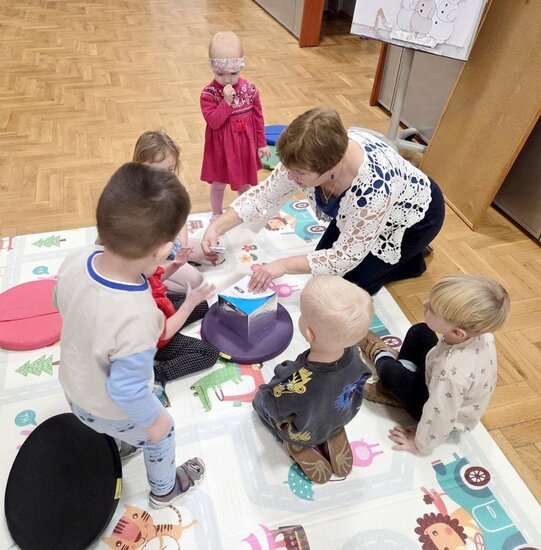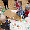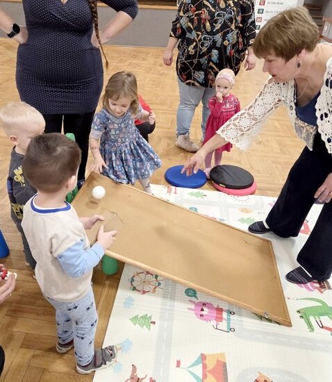 Następnie maluchy mogły zobaczyć, co spada szybciej po pochyłej desce. Łatwo dostrzegły, że piłka zdecydowanie wyprzedza kartonik. Nie mogło zabraknąć elementów muzycznych, a odsłanianie dzwoneczków ukrytych w kartonie dało dużo radości.