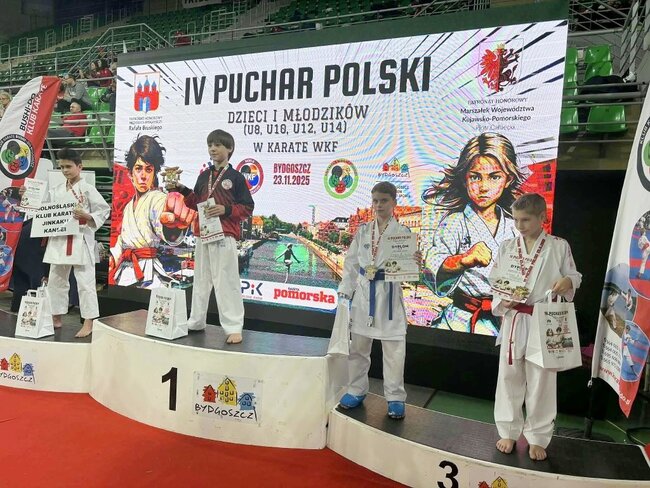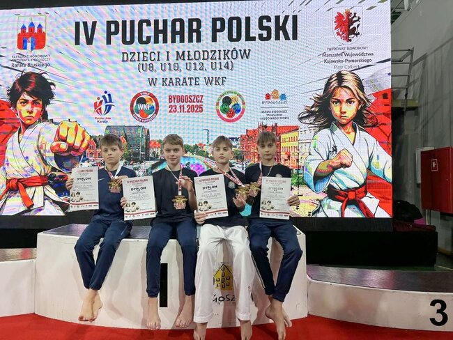 4 medale (dwa złote i dwa brązowe) to wynik zmagań zawodników# Klubu Karate Stowarzyszenie Sportowe Yamabushi podczas rozgrywanego w Bydgoszczy w dniu 23 listopada 2025 r. IV Pucharu Polski w Karate Dzieci i Młodzików.