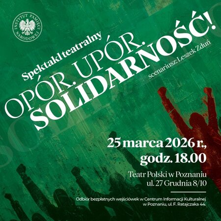 Zapraszamy na spektakl# „Opór. Upór. Solidarność” (scen. Leszek Zduń), który odbędzie się 25 marca 2026 r. o godz. 18:00 w Teatrze Polskim w Poznaniu. Bezpłatne wejściówki odbierać można w Centrum Informacji Kulturalnej przy ul. Ratajczaka 44.