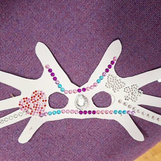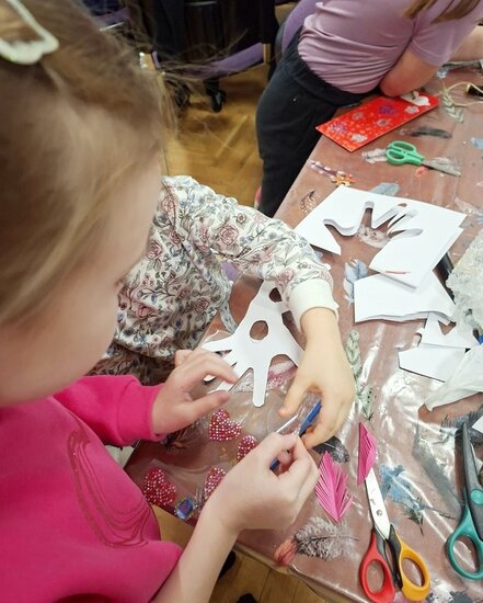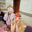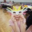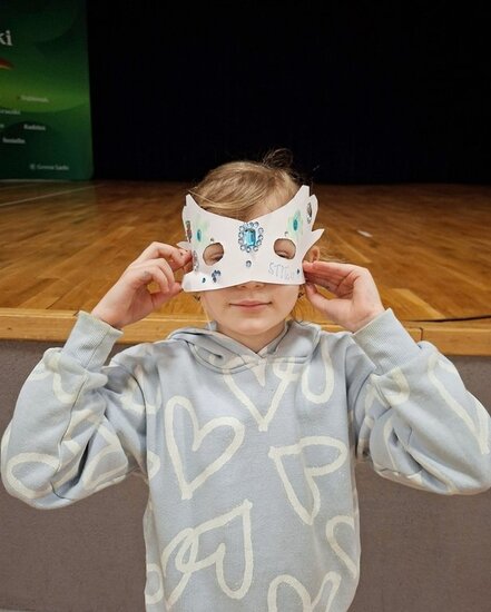 Na zakończenie chętne dzieci wykonały własną maskę wenecką, wykorzystując papierowe piórka oraz kolorowe cekiny. Była to doskonała okazja do rozwijania kreatywności, wyobraźni i zdolności manualnych.