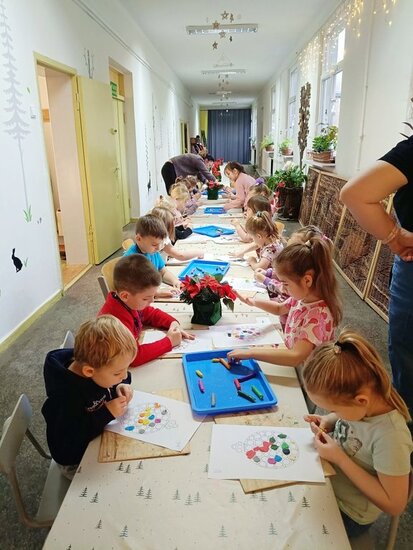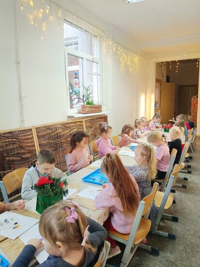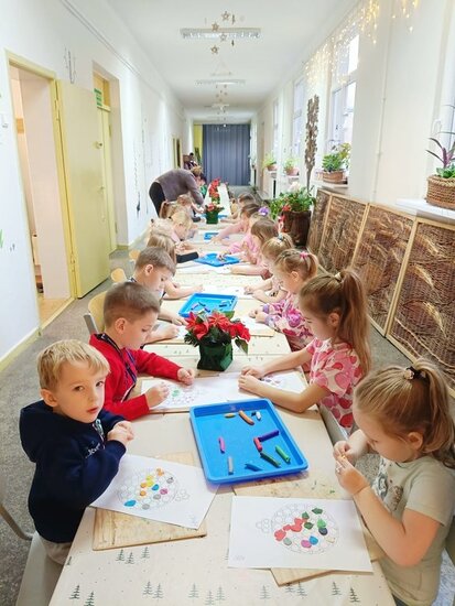 Na początku zajęć dzieci odpowiadały na pytanie, co najbardziej lubią robić w święta i co w nich najbardziej cenią. Najczęstszą odpowiedzią było ubieranie wraz z rodzicami choinki i wspólne zabawy na śniegu. Przedszkolaki wysłuchały opowieści o przygodach małej myszki Myszonka i jego niecierpliwym wyczekiwaniu Świąt oraz upragnionego skrzata, który przynosi prezenty. Nie zabrakło rozmowy o naszych regionalnych tradycjach o Gwiazdorze, 12 potrawach, czy zwyczaju kładzenia sianka pod obrusem. Każde dziecko miało możliwość wylosowania przedmiotu kojarzącego się z zbliżającymi się świętami z specjalnego worka. Po takiej dawce nauki trzeba było trochę się rozruszać przy świątecznych piosenkach.