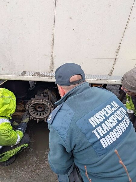 W naczepie, przy prawym kole pierwszej osi, brakowało tarczy hamulcowej. Usterkę zakwalifikowano jako niebezpieczną. Inspektor wydał bezwzględny zakaz dalszej jazdy do czasu jej usunięcia a na miejsce przewoźnik zadysponował mobilny serwis techniczny który to usunąć miał defekt techniczny.