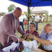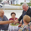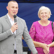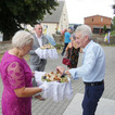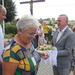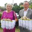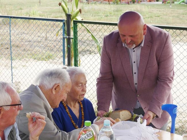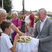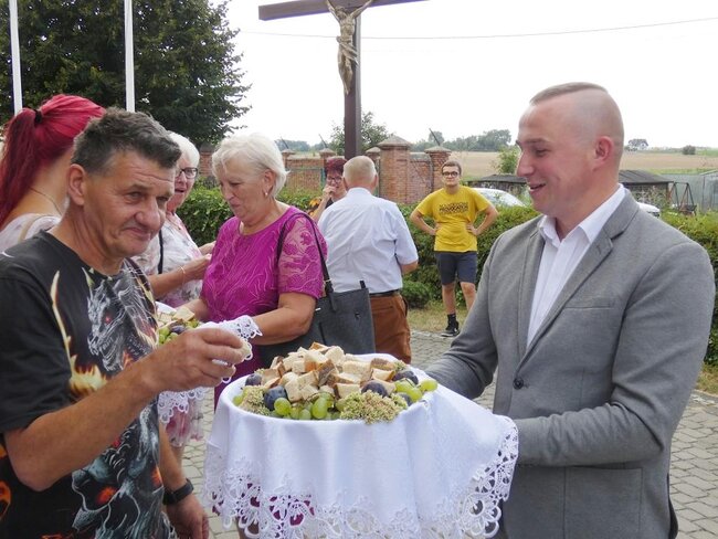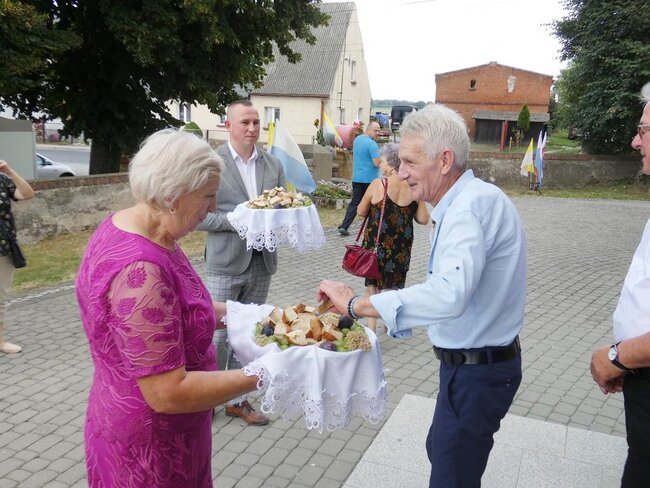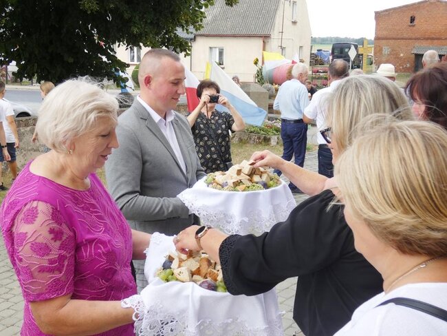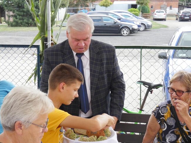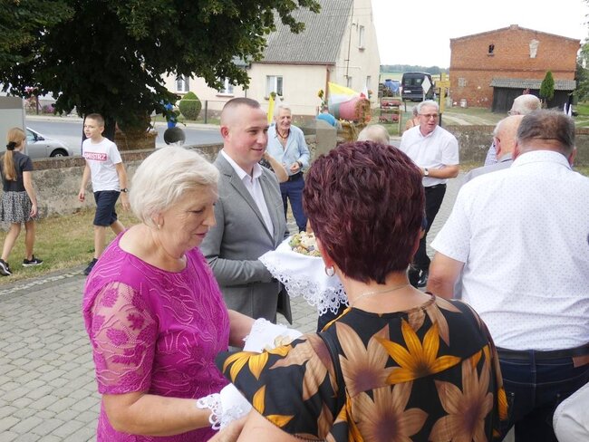 Po zakończeniu mszy świętej, wierni zostali poczęstowani chlebem przez sołtysa Dębowa Michała Olejniczaka oraz sołtysa Broniewa Alinę Musiał. W dalszej kolejności wszyscy udali się na teren boiska szkolnego, gdzie odbyła się dalsza część uroczystości. Tam również przybyli goście w osobach wójta Sadek Michała Piszczka, proboszcza ks. Krzysztofa Wiśniewskiego oraz radnych powiatowych Edwarda Kominiaka i Anety Skieresz poczęstowali chlebem wszystkich uczestników dożynek.