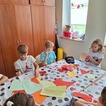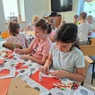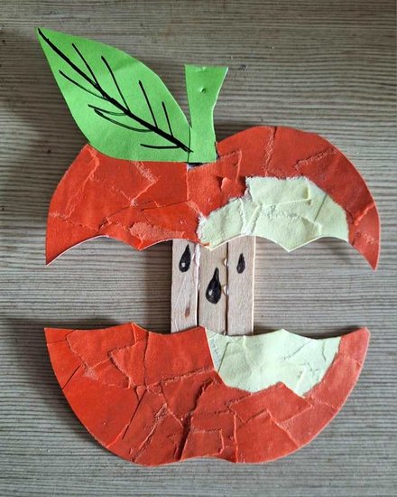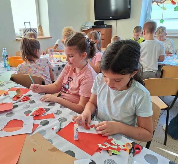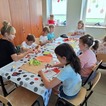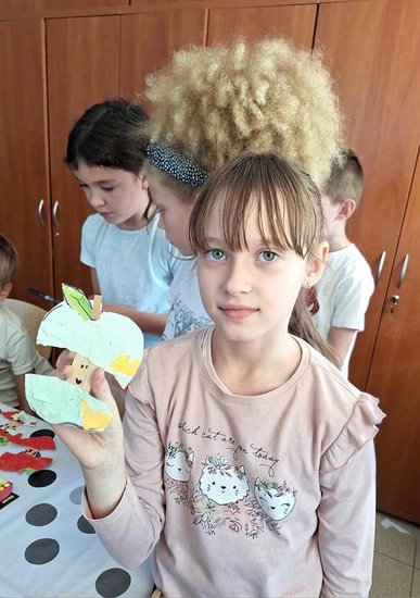 W części plastycznej dzieci wyklejały kontury kolorowymi kawałkami papieru. Następnie wycinały jabłka i przecinały je na pół. Odpowiednio doklejone drewniane patyczki dały nam efekt częściowo zjedzonego owocu. Drugoklasiści chętnie dorysowali na patyczkach pestki. Dodatkowo każdy wykonał jeszcze jedno jabłko, które ozdobi naszą gazetkę ścienną.