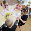 Naszą pracą plastyczną były papierowe torebeczki, które maluchy najpierw kolorowały. Z przyjemnością naklejały na nie różne naklejki. Po złożeniu mogły umieścić w nich kwiatki z papieru, które także samodzielnie wykonały.