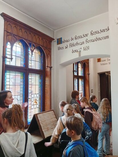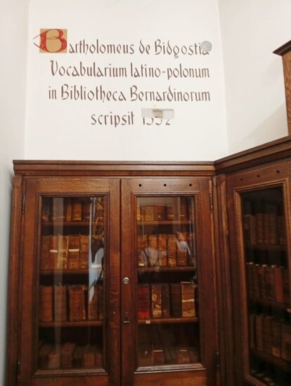 Szczególne wrażenie zrobiła na nas poklasztorna biblioteka bernardynów – najstarszy i największy z zachowanych w mieście księgozbiorów, którego początki sięgają końca XV wieku. Zabytkowy księgozbiór liczy 1374 woluminy zawierające 1555 dzieł. Wśród nich znajduje się 25 wydań Biblii (w tym dziewięć z XV wieku), księgi liturgiczne, zbiory kazań oraz żywoty świętych, m.in. trzy XV-wieczne wydania „Złotej legendy” Jakuba de Voragine - jednej z najpoczytniejszych książek średniowiecza. Prawdziwą chlubą zbioru jest 97 inkunabułów (druków wydanych do 1500 roku). Najciekawszym z nich jest unikatowa w skali światowej ulotka Hieronima Savonaroli „Reguła dla wszystkich zakonników”, wydana we Florencji w 1489 roku. Co niezwykłe – odnaleziono ją w makulaturze wyściełającej okładkę innej książki!
