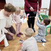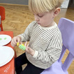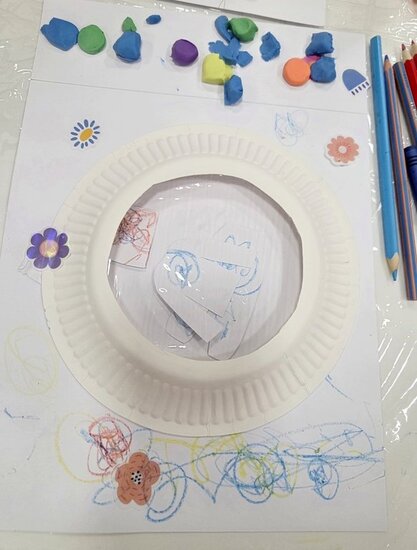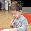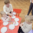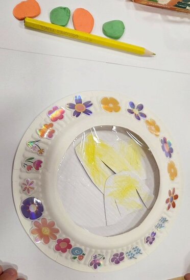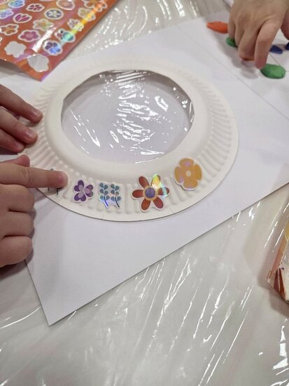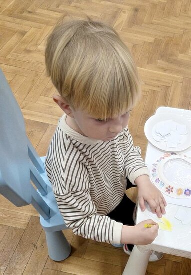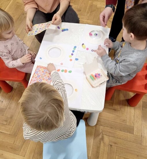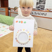 Maluchy miały okazję stworzyć swoje pralki. Montowały na nich guziki z plasteliny oraz wiosennie je przystrajały naklejkami w kwiaty. Ponieważ można było je otwierać, dzieci musiały pokolorować ubranka, które później można było do nich wkładać.