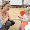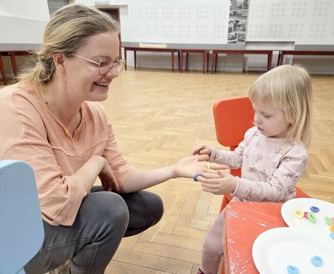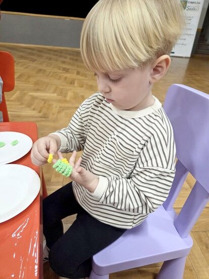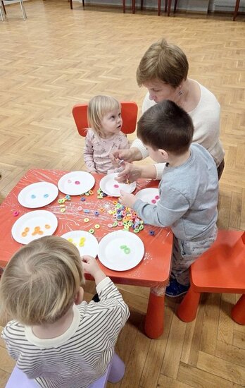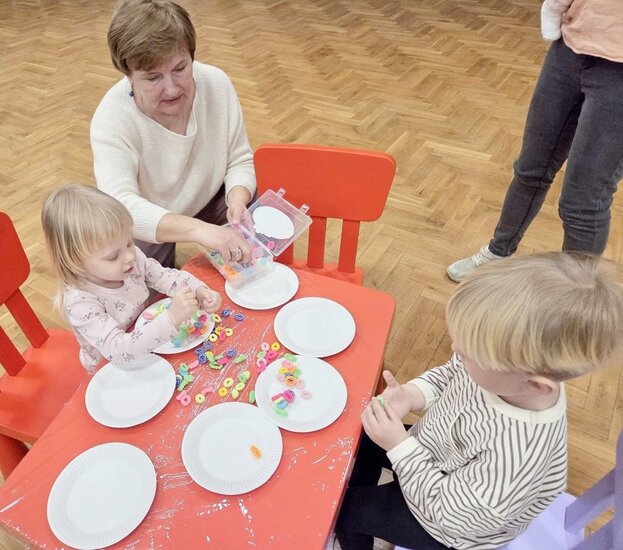 Na zakończenie prowadząca zaproponowała zabawę kolorowymi gumkami, które trzeba było odpowiednio ułożyć na paluszkach.