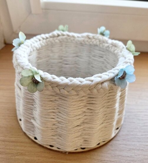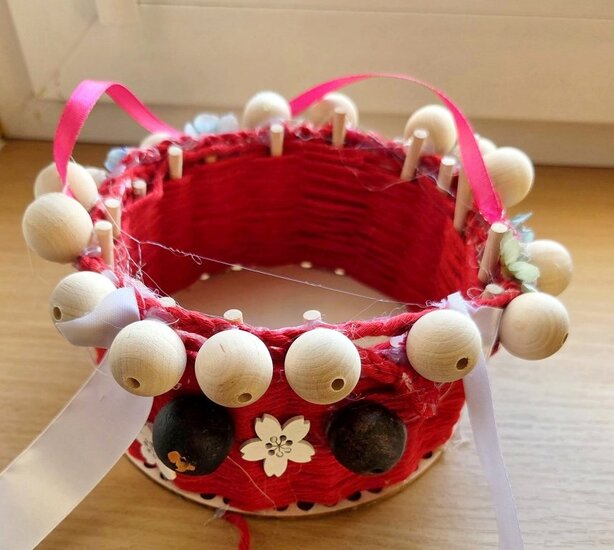 Drewniana baza i patyczki stworzyły tzw. szkielet. Następnie w ruch poszły kolorowe sznurki. Część osób wykonała tę pracę już na poprzednim spotkaniu. Wówczas wykańczały one koszyczki, a także dekorowały je kokardkami, kwiatkami itp. Każda praca była inna, wszystkie wykonane z dużym zapałem.